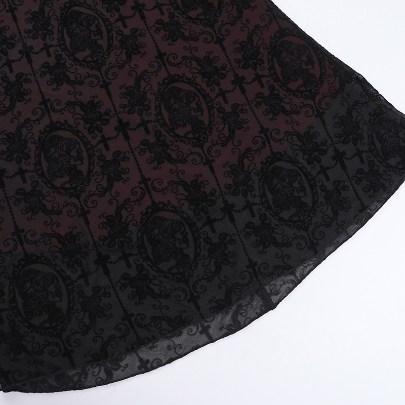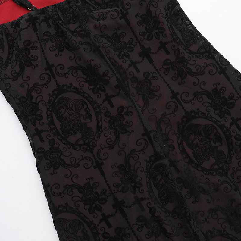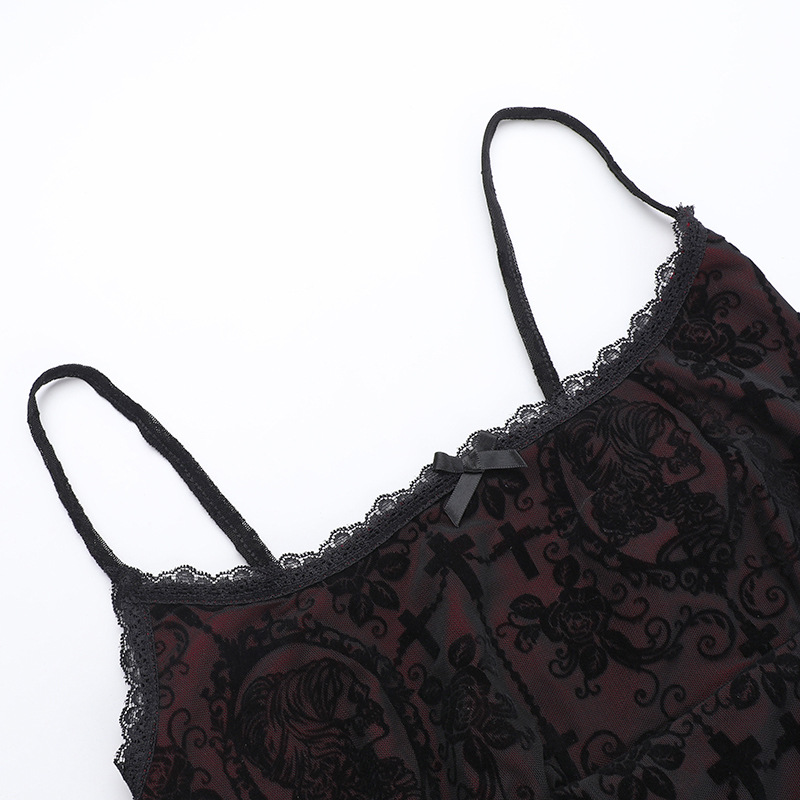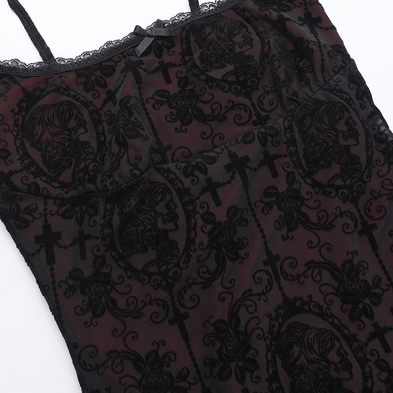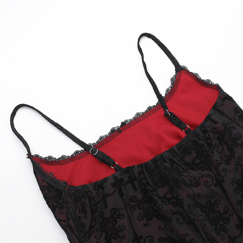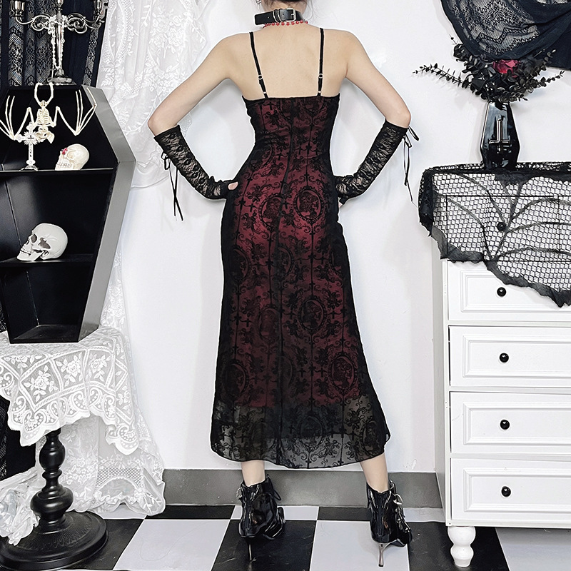 Su diseño incluye un escote palabra de honor (slash neck), delicados tirantes finos (spaghetti strap) y un detalle de encaje que aporta un aire femenino y sofisticado. La longitud mid-calf lo hace ideal para combinar con botas, tacones o accesorios góticos.